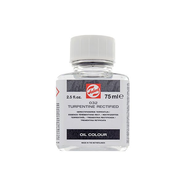 Purpose: Thinning oil colour and cleaning brushes and other art materials Composition: Portuguese gum turpentine (distillate from resinous balsam of the pine tree) Makes oil paint leaner (use in lower layers) Allows brush stroke to run Suitable for removing (dry) varnish coats Suitable for dissolving (natural) resins Also for thinning mediums and varnishes for oil colour Flammable