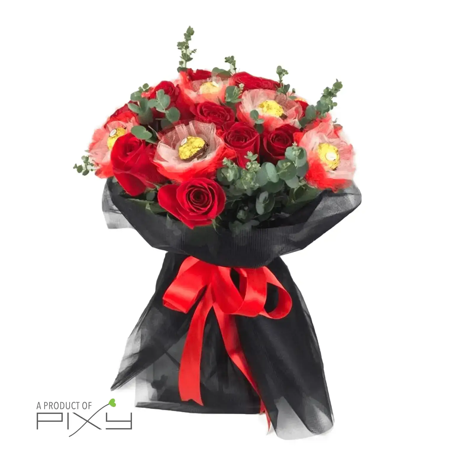 Make her heart swoon with this Red roses and Ferrero chocolate truffles all wrapped up in one stunning black jaquard mesh bouquet. You don’t even have to add chocolates to your flowers, we have already done it for you!