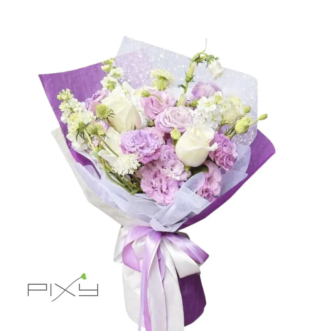 Commemorate her brilliance with this breathtaking presentation. Soft lilac blooms and creamy white roses are expertly enveloped in regal violet paper and delicate textured mesh. Bound with flowing satin ribbons, this arrangement radiates quiet confidence, making it a spectacular tribute for International Women’s Day.