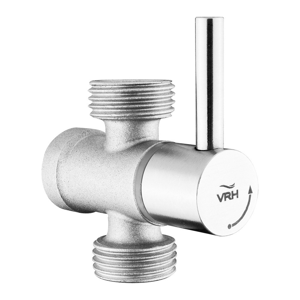 VRH wall-mounted 3-way stop valve for bathroom plumbing. Allows individual water supply control to multiple fixtures from a single point. Chrome-plated brass body with ceramic disc cartridge for leak-free operation.