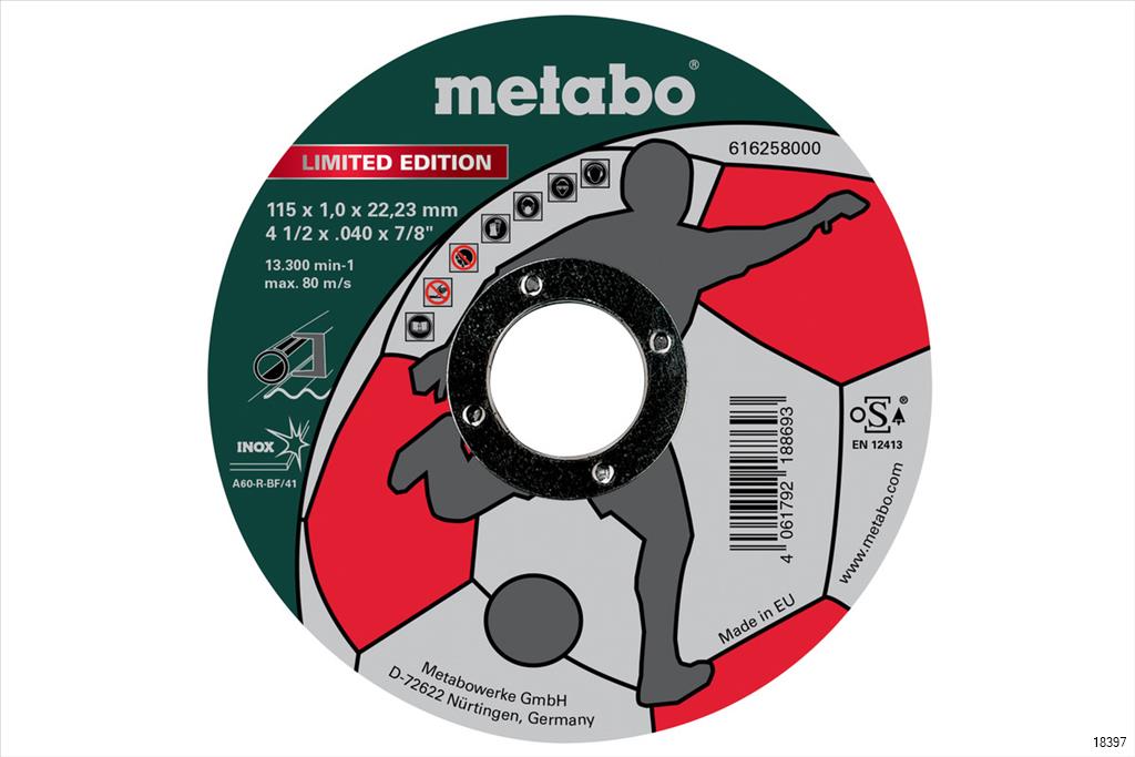METABO SS CUTTING WHEEL 115MM LIMITED EDITION SOCCER INOX TF 41. Professional-grade power tool accessory for cutting, drilling, or finishing.
